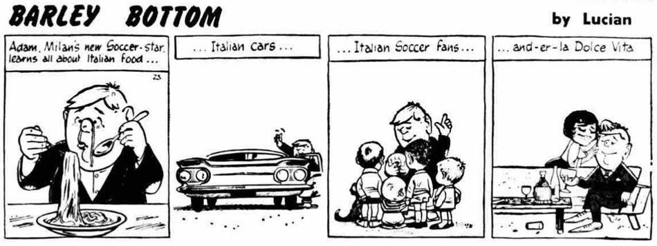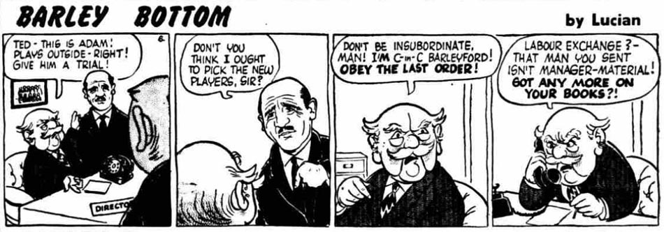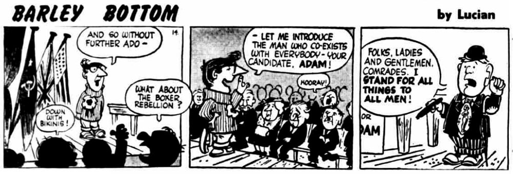According to the website Leftontheshelf.com, Derek Chittock shared the pen name "Lucian" with the British writer and humorous poet Roger Woddis, with Chittock doing art and Woddis writing duties. Lucian was credited with the 'Barley Bottom' (1961-1964) strip, which brought a satirical reflection of life in Britain through a fictional small town. The series' main hero was the simple and honest, but unambitious farmhand Adam, who is always urged by the town's beauty queen Sally to better himself. 'Barley Bottom' debuted on 18 September 1961. With one month overlap, its publication rhythm has a close fit with that of 'Benny'. 'Barley Bottom' ended on 14 September 1964, around the time when the Daily Herald ceased publication.