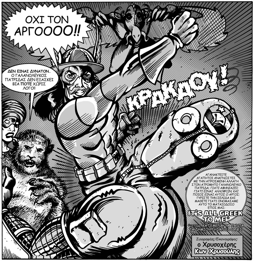 His indie work got Chrisoulis noticed by the mainstream press, leading to freelance work for 9 (Ennea), a free comic magazine distributed on Wednesdays within the Eleftherotypia newspaper. Between 2002 and 2006, 9 magazine serialized his sci-fi series 'Vacant Testament' ('Κενή Διαθήκη') and several short stories. In 2007, Chrisoulis released the first volume of his acclaimed political satire comic book series, 'Giant-Size Fascists', starring a group of far-right Greek superheroes who retired to New York after the 1974 fall of the military junta. Subsequent episodes were serialized in 2007-2008 in Galera magazine (Γαλέρα), before appearing in print in the second volume released by Jemma Press (2009). Also rooted in his Greek heritage was Chrisoulis's graphic novel 'Dryland' (2011-2015), that narrated the violent deaths of his ancestors in Interwar Greece. After online serialization, the story was released in book format by Markosia in 2016. By then, Con Chrisoulis was however already living in the UK.