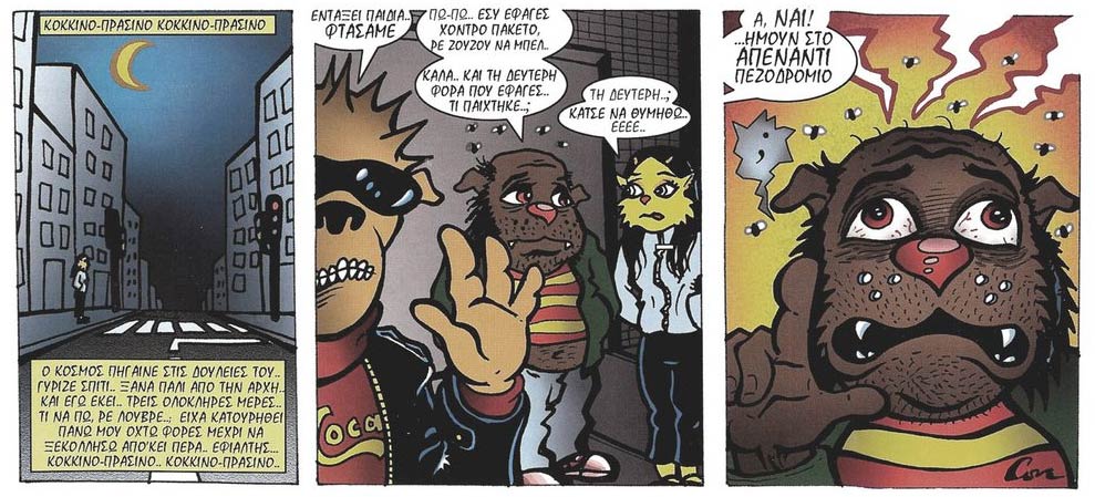 In the late 1990s, Chrisoulis moved to Athens, Greece, where he continued self-publishing comics. His anthology series 'Tales of Unsurpassed Vanity' ('Ιστορίες Ατελείωτης Ματαιοδοξίας', 2001-2004) became one of Greece's longest-running self-published independent comic series, lasting ten issues. Besides short comedy stories with characters like the weed-smoking stray dog Louvre De Buff and Punky Smurf, the volumes also had continuing stories like 'Jazz & Maria' - about vampire club kids - and 'Three Kings', in which Elvis, Bruce Lee and Jim Morrison team up to fight evil.