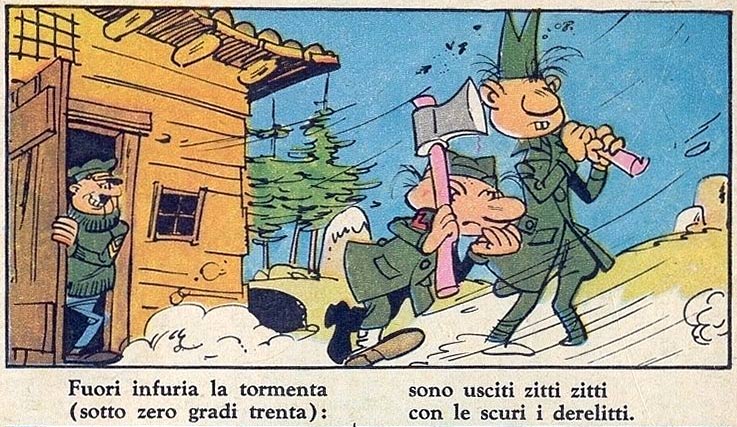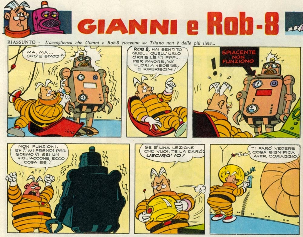 The largest part of Cimpellin's output of the 1950s and 1960s could be read in the children's magazine Il Corriere dei Piccoli, for which he became a staff artist in 1953. He established himself as a talented humor artist, working with scriptwriters like Guglielmo Zucconi, Carlo Triberti and Vezio Melegari on a variety of series. His most notable (co-)creations for this magazine were 'Papero Grosso e Fiorello' (1954), about a fat peasant and his little pig, 'Codinzolo', about a little faun, and 'Gibernetta' (1958), a parody of army life. These were followed by the reckless driver 'Carletto Sprint' (1961), the tragicomic adventures of the Roman legionary 'Tribunzio' (with Triberti, 1966) and the journalist 'Gigi Bizz' (1967). Further creations for the Corriere were the space adventures of a quiet ministry official and his robot, 'Gianni & Rob-8' (1969), as well as 'Gelsomino', 'Tam Tam' and 'Nero Fumo'. Several of his creations for this magazine have been reprinted in publications from Spain, Argentina, Turkey and Chile.