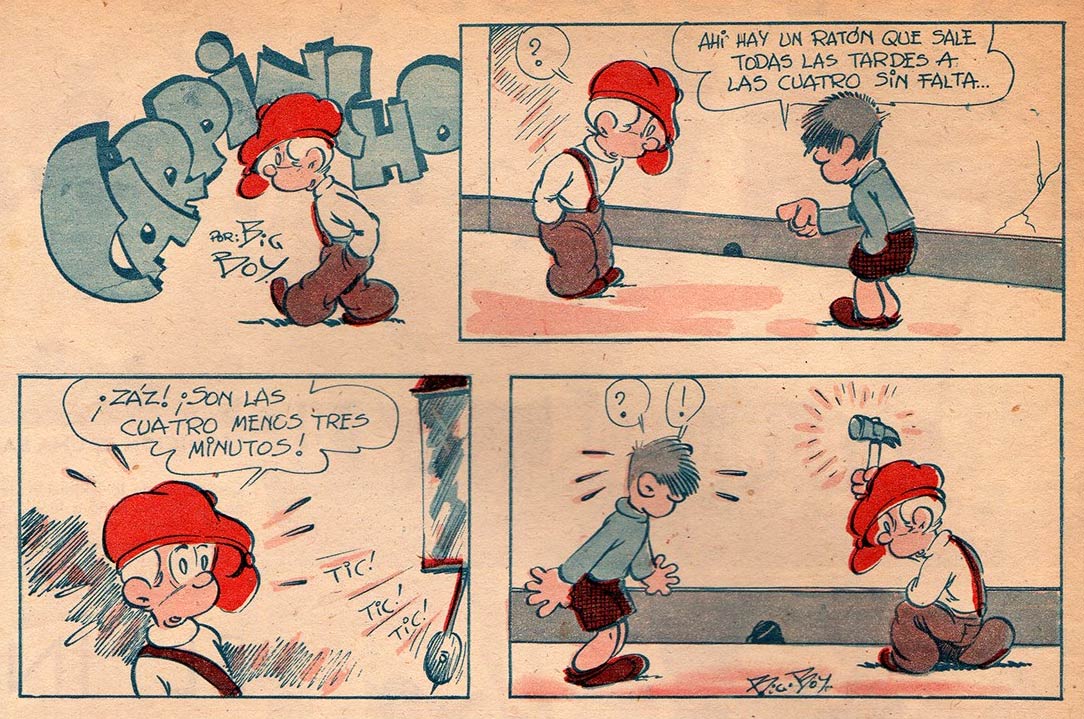 In 1937, Clémen became a prominent artist in the weekly magazine Figuritas, which tried to compete with the popular children's weekly Billiken. Subtitled "La Revista Argentina del Escolar" ("The Argentinian School Magazine"), it lasted little over ten years, during which Clémen drew comic strips and serials, as well as cartoons and illustrations for educational editorial pages. With humorous features like 'Carpincho' and 'Las Aventures de Pepe Bujía y su Ayudante Cometa' (both signed with "Big Boy"), as well as the serials 'El Imperio Submarino', 'La Estrella Polar', 'El Tesoro del Muerto', 'Urania' and 'Pawnee Bill', Carlos Clémen developed his personal and influential drawing style. A notable Clémen series for Figuritas was 'El Pie del Diablo', which was an ongoing story with an activity element. With its "Great Contest of Lost Objects", readers had to search the panels for something supposedly lost by one of the characters, mark it with a pencil and send it to the sponsor, the commercial firm Cía. Toddy. Every month, a bicycle, five soccer balls and five dolls were awarded to randomly selected contestants.