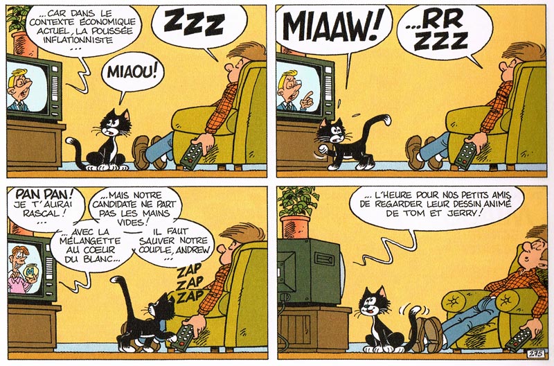 'Poussy' (Schtroumpf #14, November 1990). Poussy turns the channel to watch Hanna-Barbera's 'Tom & Jerry'.
