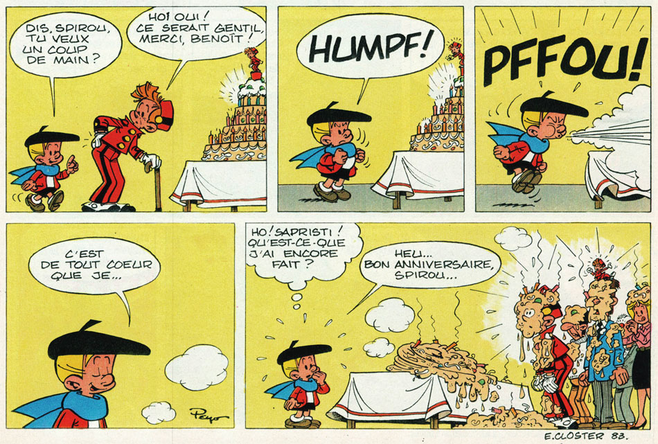 Through Leonardo, Closter was introduced to Peyo, who was looking for assistants. Joining Peyo's studio in the early 1980s, he was trained in drawing Peyo's creations by Daniel Desorgher. In 1983, Closter drew a gag page with Peyo's 'Benoît Brisefer' character on the occasion of Spirou magazine's 45th anniversary. With Desorgher, he additionally worked on the artwork of the 'Smurfs' story 'Le Bébé Schtroumpf' ('Baby Smurf', 1984), and also on artwork for many merchandising items with the Smurfs. At one point, Closter was briefly an assistant for 'Spirou et Fantasio' artists Tome & Janry, but they soon found a more suitable match in Bruno Gazzotti, while Closter returned to Peyo.