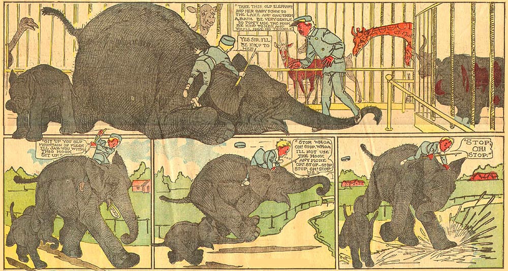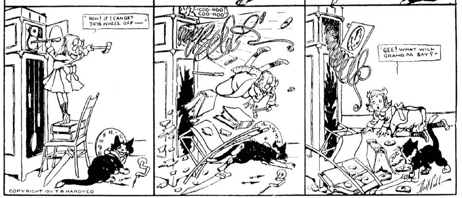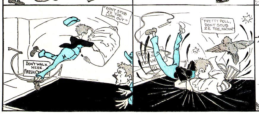 Between 21 April 1907 and 12 January 1908, Cobb drew 'Ambitious Teddy' for the Sunday supplement of The Boston Herald. The comic centers on a young boy who tries a different job in every episode, but then something goes disastrously wrong. As the series went on, Teddy found himself more in fantasy-like settings, reminiscent of Winsor McCay's 'Little Nemo in Slumberland'. On 1 December 1907, the comic was as a result retitled to 'Ambitious Teddy in Mother Gooseland'. A companion piece to 'Ambitious Teddy' was the less inspired and therefore short-lived 'Stumble-Toe Joe'. Between 21 April and 18 August 1907, the lanky boy Stumble-Toe Joe tripped in every gag, usually carrying something fragile to enhance the comedy effect. Another short-lived gag comic was 'Meddlesome Millie', which ran two or three times a week from 3 February up until 3 May 1911. The protagonist was a young girl who simply couldn't leave people and objects alone. Every time she touched something, or interfered, she caused trouble and damage.
