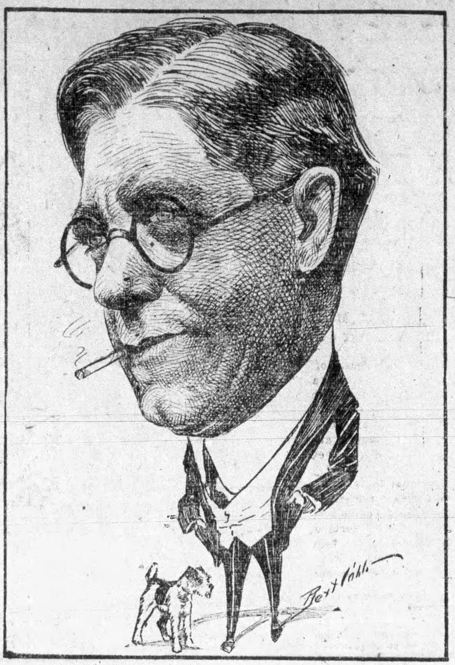 Caricature appearing with an announcement for Bert Cobb's caricature series of the Bayonne Kiwanis Club, published in the Bayonne Evening News and Bayonne Review of 29 August 1923. Is it a self-portrait, or a caricature of Rev. Belvin Maynard, also mentioned in the article?