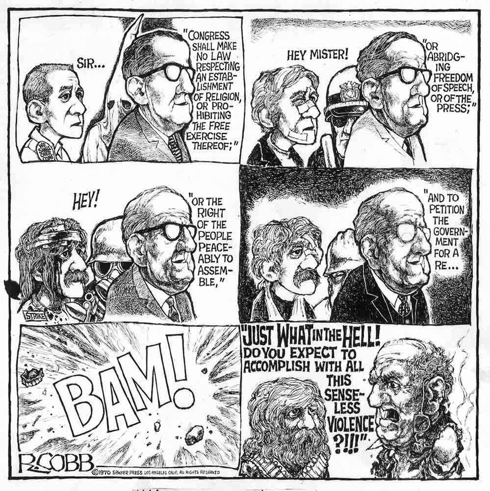In 1965, Cobb returned to his civilian life. He decided to become a cartoonist, but his initial work was rejected by Hugh Hefner's Playboy. He found a more receptive environment in the underground newspaper the Los Angeles Press. Cobb's cartoons were notable for their thought-provoking and wry criticism of the Lyndon B. Johnson and Richard Nixon administration, pollution, racism, militarism, poverty, consumerism, religion, nuclear energy, the Watergate affair and the Vietnam war. Their anti-establishment attitude perfectly encapsulated the spirit of the times and were therefore featured in various sister publications of the Los Angeles Press and many other left-wing magazines all across the globe. They appeared among others in the Berkeley Barb, the Chicago Seed, the East Village Other, Lot's Wife, and Farrago. Cobb also illustrated covers for the magazine Famous Monsters of Filmland. Cobb stayed with The Los Angeles Reader until 1970. His work was published in six compilation books: 'RCD-25' (Tarzana, Sawyer Press, 1967), 'Mah Fellow Americans' (Underground Press Syndicate, 1968), 'Raw Sewage' (Price Stern Sloan and Sawyer, 1970), 'My Fellow Americans' (Price Stern Sloan and Sawyer, 1970), 'The Cobb Book' (Wild & Woolley, 1975) and 'Cobb Again' (Wild & Woolley, 1978).