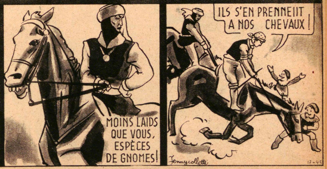 Not much is known about the artist Jenny Collette. Together with Marie Jaminet and Minou, she was among the few female illustrators of Grand Coeur (1945-1947). According to the book 'Dictionnaire Illustré de la Bande Dessinée Belge de la Libération aux Fifties (1945-1950) by Frans Lambeau, she was married to Charles Gilbert, the comic artist and editor of Grand Coeur. This short-lived comic magazine was created by Charles Gilbert in collaboration with Étienne Lamarche, publisher of the newspaper La Gazette de Liège. A large part of the material in Grand Coeur was provided by Charles Gilbert and students from his graphic arts atelier in Liège, and apparently he also had his wife join in on the production.