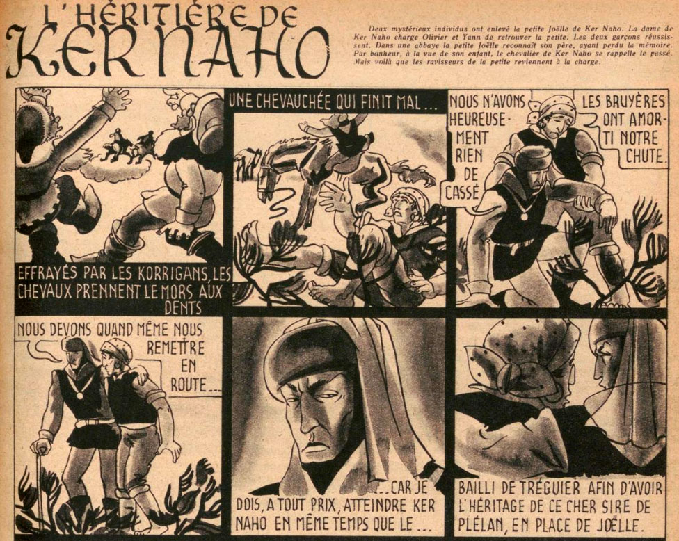 Serialized in Grand Coeur issues #27 through #50 of 1946, Collette's adventure serial 'L'Héritière de Ker Naho' is set in Brittany, where a young girl called Joëlle is kidnapped through the secret passageways of Ker Naho castle. The girl's mother organizes a rescue mission and entrusts the chase to the shepherd who witnessed the abduction from afar. When the girl is saved, the shepherd is rewarded by the King of France in person. And by the time she has grown up, Joëlle marries her savior.