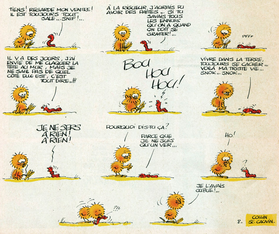 With scriptwriter Raoul Cauvin, Collin subsequently made little over a dozen gags starring the philosophical and observant chick 'Christobald' (Spirou, 1975-1976). In 1977, Collin drew the three-page story 'Authentique: Histoire à Rire et à Pleurer' for issue #34 L'Écho des Savanes (written by Yves Frémion). In 1978-1979, her artwork additionally appeared in the first three issues of Le 9e Rêve, the student magazine of the Saint-Luc comics section.