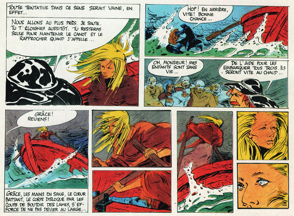 Collin additionally teamed up with writer Jean-Marie Brouyère to create the psychedelic science fiction comic 'Les Naufragés de l'Escalator' ("The Castaways of the Escalator", 1973-1975). A modern version of 'Alice in Wonderland', the comic was situated in a world of consumption, where escalators lead the main characters to the strangest places. Fired by the "Genius-Center", the model Pastille decides to get her revenge by taking her three friends on a journey through this super-hypermarket, where they enjoy all of its pleasures without spending a penny. However, visitors with no money can end up as raw material for the sausages sold at the center. While Pastille knows all of the commercial traps, some of her friends have difficulties resisting the advertisements, and the team end up on the "shipwreck escalator", from which you never return. From the start, this strange and almost delirious series polarized readers. Some were puzzled by its weirdness, others were fascinated by its experimental nature. Still, after four short stories and a full serial of 44 pages, the feature was discontinued.