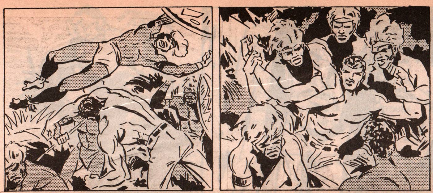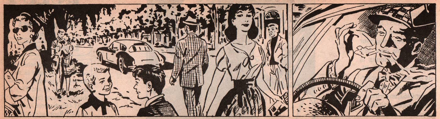 Between 1955 and 1957, L'Équipe ran five stories in 815 strips of jungle adventurer 'Raoh'. Drawn by Roland Colomb, the stories were written by Martin Bach and later by Robert Poc. In 1961 and 1962, the signature of Rold appeared once again, this time with an adaptation of the motor racing novel 'The Green Helmet' by the Australian author John Cleary. Rold's 'Le Pilote au Casque Vert' abruptly ended in mid-story on 9 February 1962, leaving it a mystery why his career was suddenly broken off. No additional information about Colomb's life after this date is available.