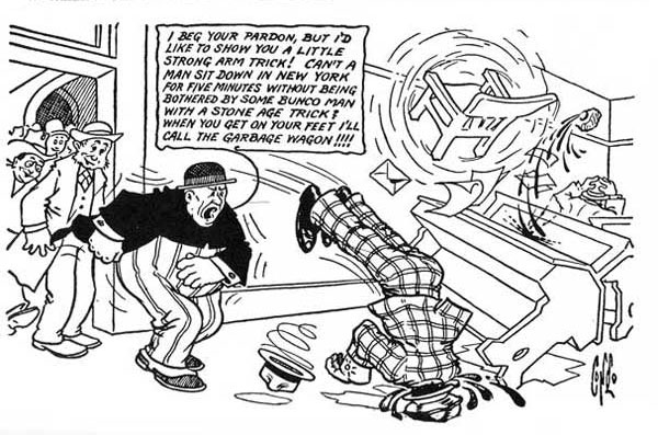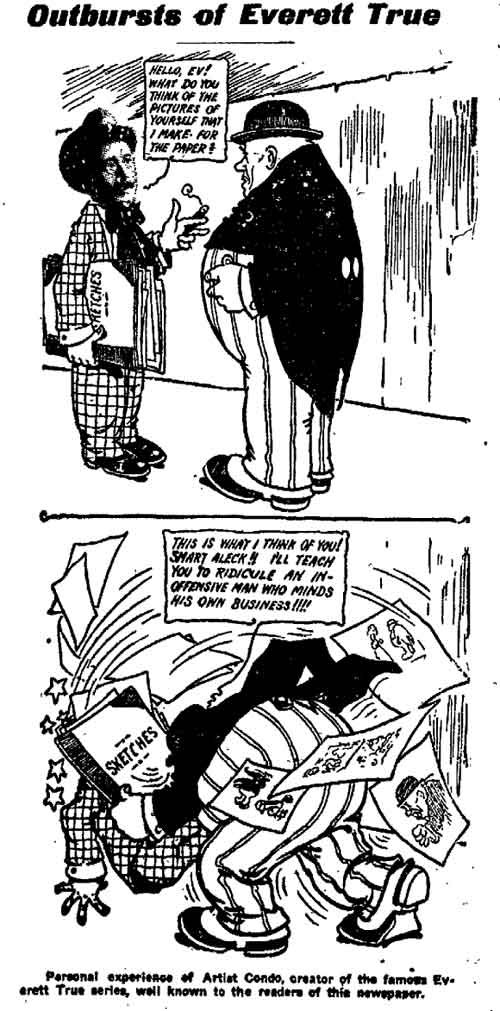 At the Newspaper Enterprise Association, Condo created his signature weekday comic 'The Outbursts of Everett True' (1905-1927), in collaboration with J.W. Raper. It debuted on 22 July 1905 as 'A Chapter from the Life of Everett True'. Originally the comic was conceived as a gag series about a man who always told the truth, even if it wasn't socially acceptable. The eventual character, named Everett True, is not necessarily always right but still believes he is. The content of 'The Outbursts of Everett True' is as simple as its lay-out. Each episode consists of only two to three panels, one to introduce a situation which annoys Everett, the other to depict his furious reaction. Everett is the crankiest character ever. He is constantly irked by things like screaming babies, boring reverends, unhelpful store owners, cars nearly running him over, nosy and noisy people and especially preachy know-it-alls. Those who are lucky are only verbally insulted. Others are beat up too. The only person who dares to yell or fight back is his wife.