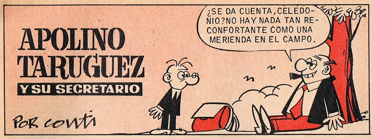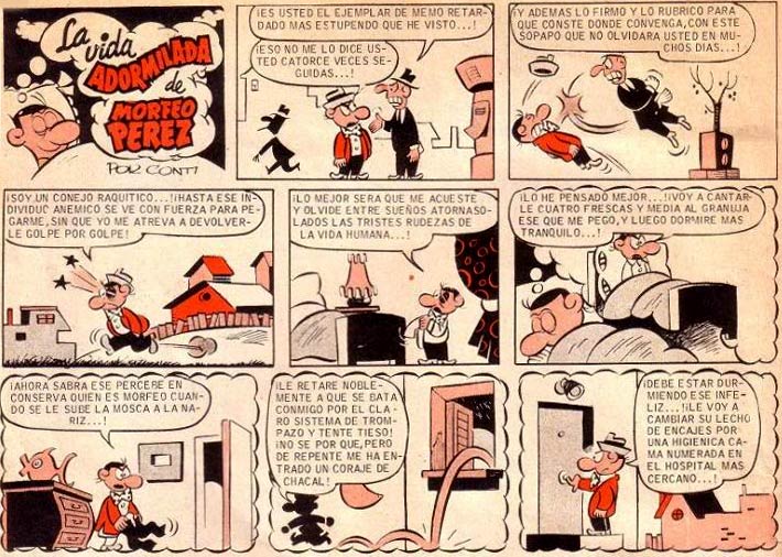 His feature 'Apolino Tarúguez, Hombre de Negocios', about the despotic businessman and his secretary, originally appeared in the magazine Cucu in 1944, but moved over to Bruguera's new humor magazine El DDT in 1951. For this magazine, Conti also created 'Mi Tío Magdaleno' (1951) and 'La Vida Adormilada de Morfeo Pérez' (1952). The latter is considered one of the highlights of Bruguera's humor features, and deals with the exciting and surreal dreams of its otherwise rather dull protagonist. Conti also appeared in the non-Bruguera magazines TBO (Editorial Buigas) and El Coyote (Ediciones Cliper).
