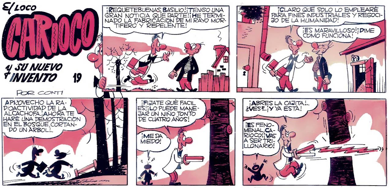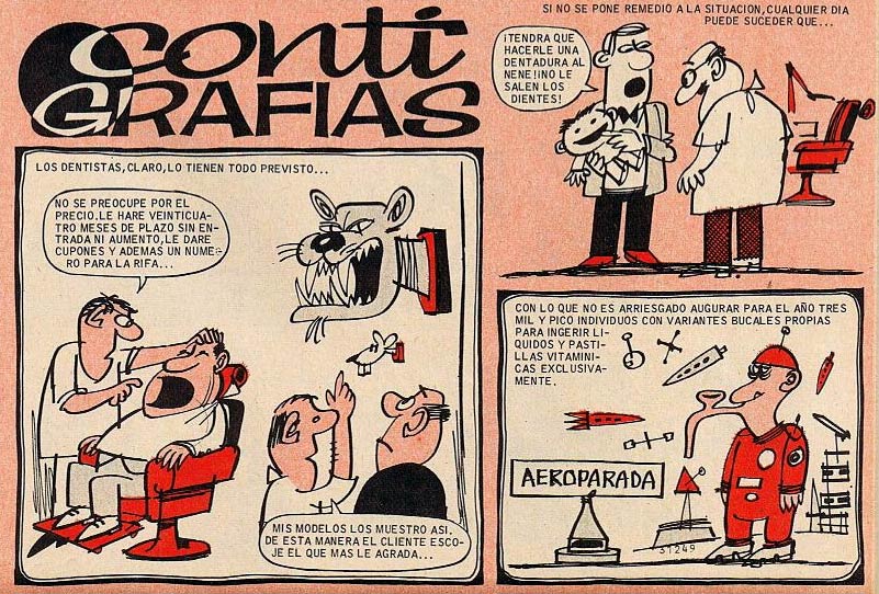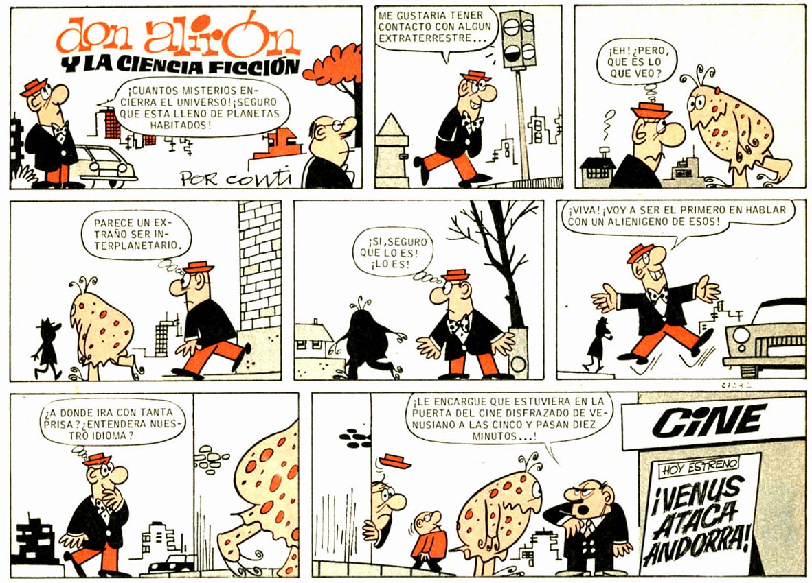 In a quest for more artistic freedom, Conti, Cifré, Escobar, Giner and Peñarroya launched and self-managed the weekly Tío Vivo in 1957, a joint venture which lasted for one year. Conti served as art director, and was succeeded by Enrich, after which he continued his classic series in the Bruguera magazines Can Can, Ven y Ven and Din Dan. Among his later creations were 'Don Fisgón' (El Campéon de las Historietas, 1960), 'Don Alirón y la Ciencia Ficción' (El DDT, 1969) and 'El Doctor No y su Ayudante Sí' (Din Dan, 1970). The latter series referenced the character Dr. No from the 'James Bond' franchise, but pitched him together with an adjudant named Sí (literally: "Yes"). Conti also served as art director of the satirical monthly Mata Ratos of Ibero Mundial de Ediciones from 1972 until 1974.