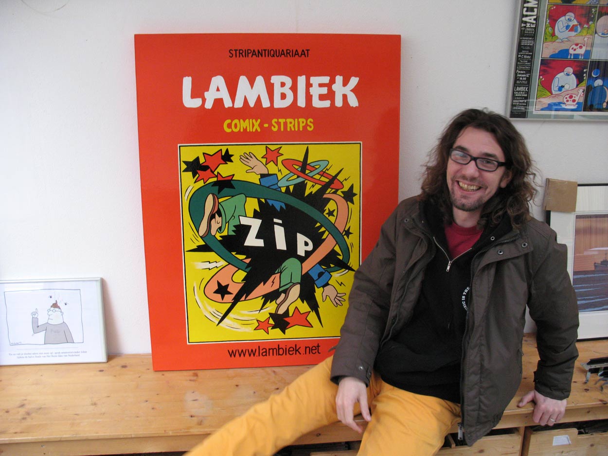 Larie Cook also painted the new Lambiek sign in 2010. The original sign was painted in the 1980s by Onno Docters van Leeuwen, based on an idea by Herwolt van Doornen and Job Goedhart.