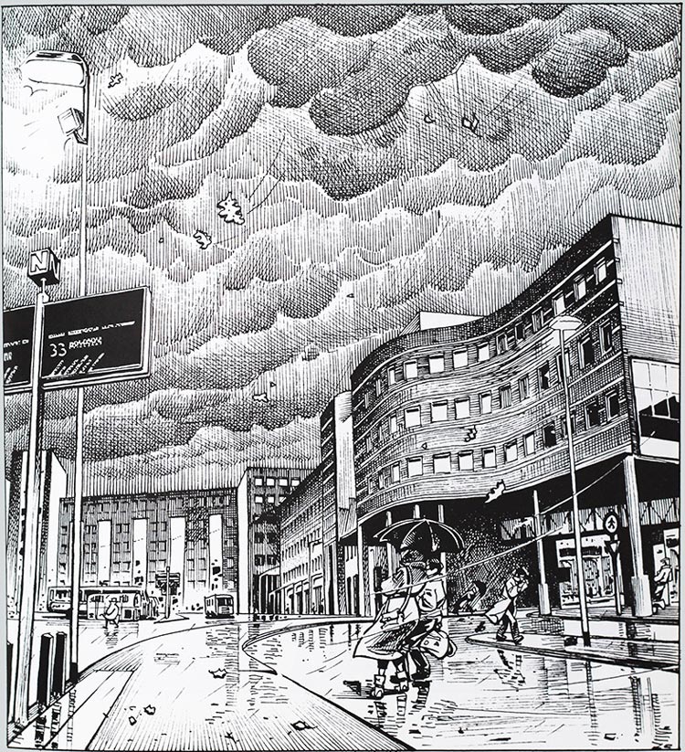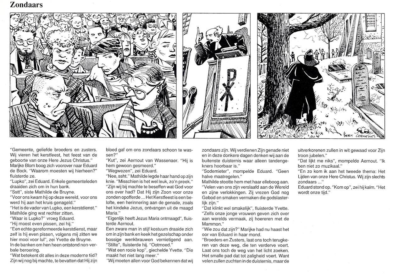 Cornelius' most notable work was the text comic 'Mussengang' (1984-1995), which appeared on the back page of the Universiteitskrant. The texts were written by a collective consisting of Frank den Hollander of the University library and then-editor-in-chief Luuk Hajema, among other people. 'Mussengang' dealt with everyday life in a Groningen student house, and didn't shy away from showing the gritty sides of student life. The cast of characters varied throughout the years, but the initial cast consisted of Vindicat students Eduard and Jeroen de Bock, the sexy vamp Yvette de Bruyne, the reformed girl Annie Stortemelk, the flamboyant Hedwig Verschuur and squatter Fredje.
