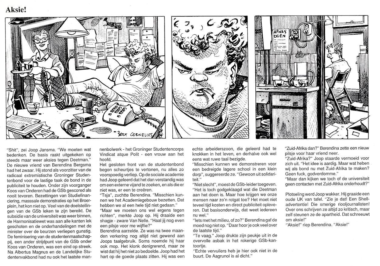 Doctor Bert Cornelius was an employee of the medical center of the University of Groningen, and staff illustrator for its campus newspaper. His best known creation was the text comic 'Mussengang' (1984-1995), about life in a student house.