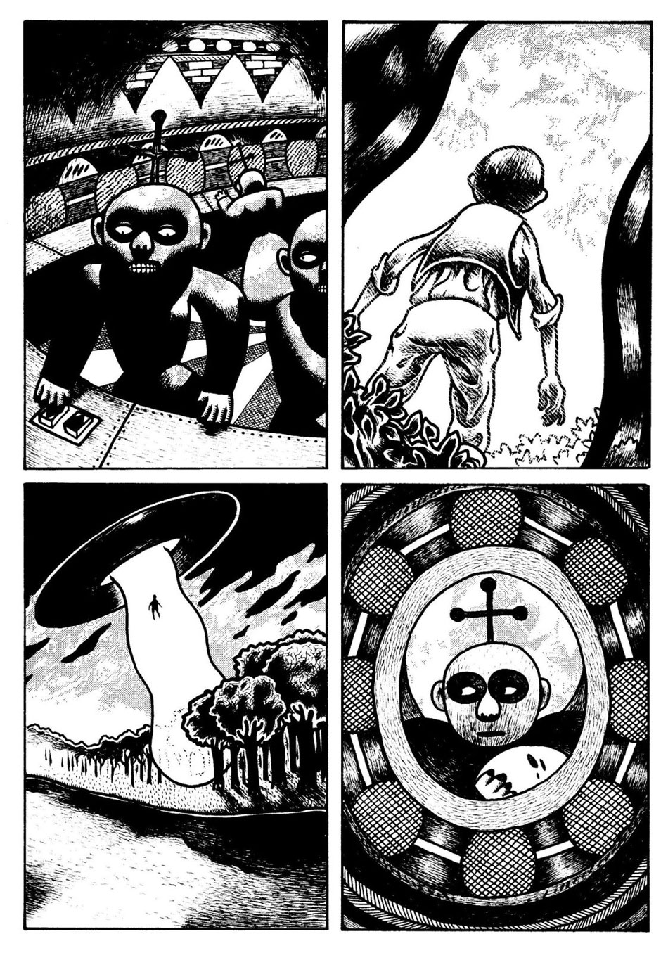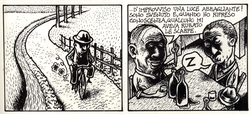 Since 2003, most of Marco Corona's graphic novels have appeared through Coconino Press, the Bologna-based alternative comics imprint of the Italian cartoonist Igort. Corona's graphic novel 'Bestiario Padano' ("Bestiary of the Po Valley", 2003) is a disturbing depiction of rural life, full of grotesque faces, gore and fantasy, with the mysterious disappearance of a woman leading to investigations outside of Earth's realms. Graphically, Corona took inspiration from the self-portraits of the early 20th-century painter Antonio Ligabue. All his characters have the same penetrating gaze, and seem to be looking straight at the reader.