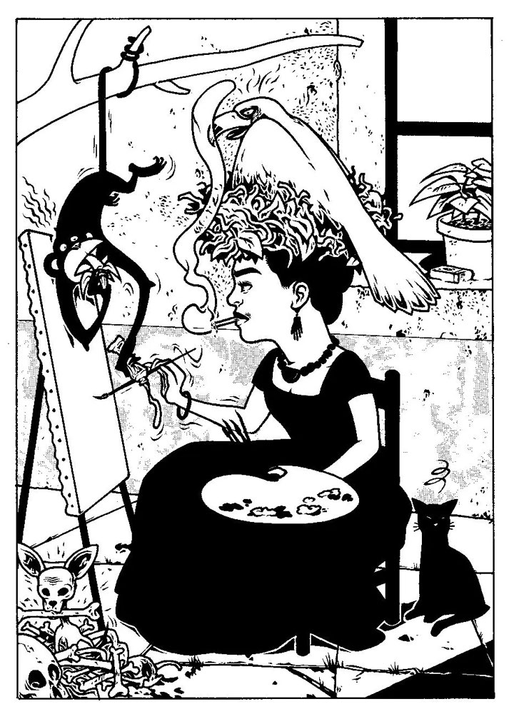In his graphic novels, Marco Corona has regularly referred to 20th-century painters, most notably the Mexican surrealist Frida Kahlo. In 1998, Corona's debut graphic novel was fully devoted to her, but by far not a chronological account. Under the title 'Frida Kahlo - Una Biografia Surreale' (Stampa Alternativa, 1998, later reprinted by Black Velvet, 2006), Corona offered a surreal exploration of her life, largely fuelled by the author's personal connection to her. Like Kahlo, Corona has had experiences with chronic pain, and through her experiences, he could capture the suffering in a visual narrative. In 2016, he made another work about the painter, titled 'Krazy Kahlo' (001 Edizioni, 2016). A combination between reprint and reboot, Corona used some of his older comics pages from the 2006 version, but added new pages, mostly with better artwork and more focus on Kahlo's hardships with her husband and her personal physical pain. The book sold very well in the Spanish-language world and was translated into French, as well as English as 'Frida Kahlo, an Illustrated Life'. Other artists who made graphic novels about Frida Kahlo have been Gilbert Hernandez' 'Frida' (available in 'Amor y Cohetes: The Love & Rockets', Fantagraphics, 2007) and 'Strange Like Me, Frida Kahlo' by Gavin Aung Than in his 'Zen Pencils' series.