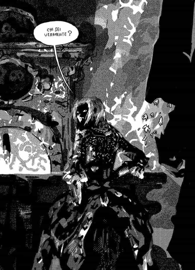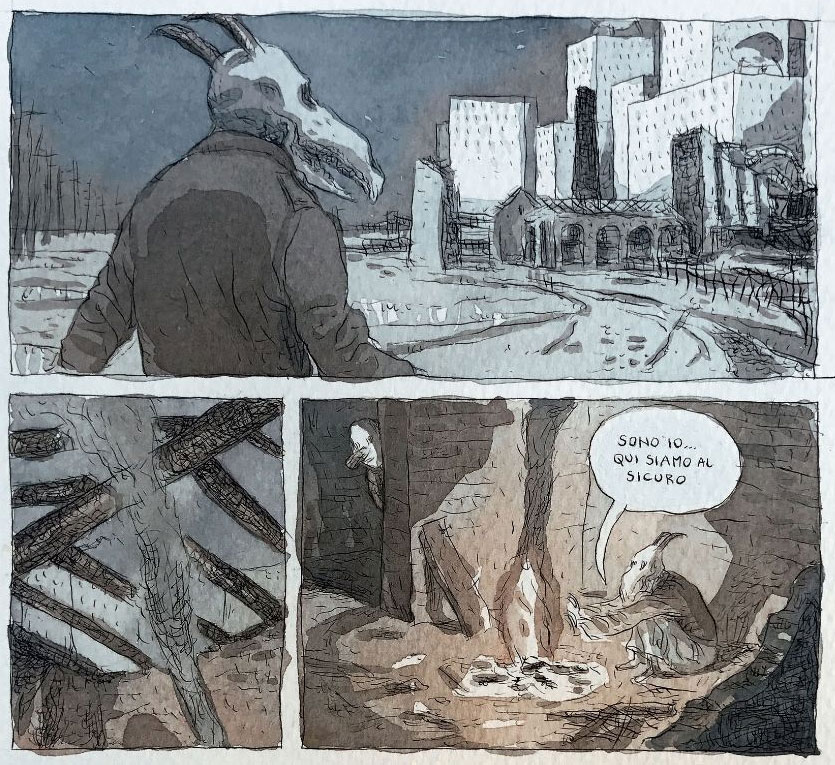 Most of Marco Corona's graphic novels are visual explorations of human emotions. With 'La Galaverna' (001 Edizioni, 2018), he made a journey of grief. In a village in the snowy Alps, Margherita, a young woman raised by nuns, crosses the forest with an ax in her hand to save her child. At an open place in the forest the orphan daughters of refugees like Margherita are preparing a mysterious magical pagan ritual. Three years later, Corona's book 'Il Viaggio' (Progretto Stigma, 2021) was a dreamlike exploration of childish and childlike terrors. The graphic novel is set in an abandoned old house, once prestigious, now in bad shape. Junks and playing children are the only current visitors. Years ago, the daughter of count Levis disappeared without a trace, while his little brother (who appears to be a ghost) befriends a group of local children. Nobody is prepared for the horrible, hallucinatory fantasy world they are about to enter.