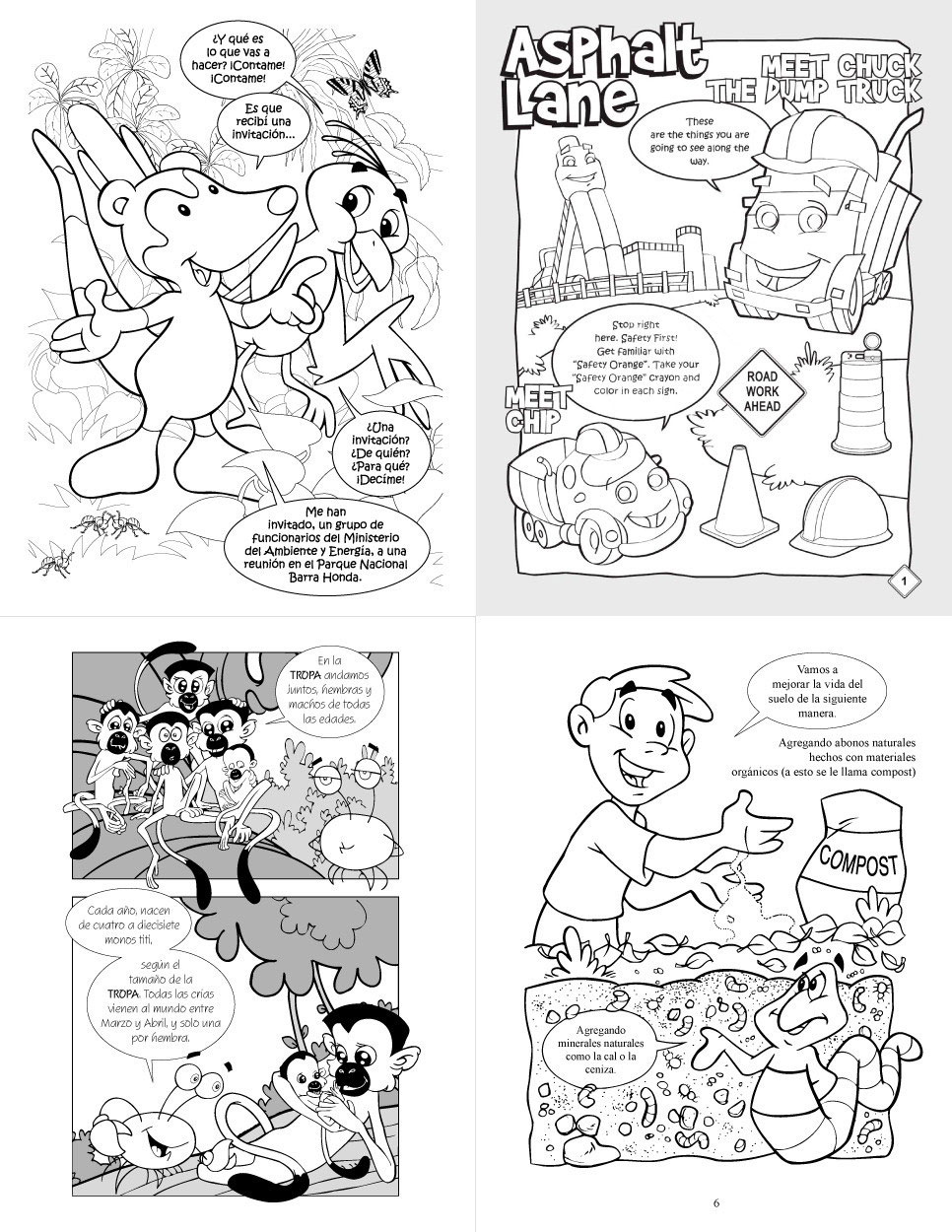 Selection of work from comic activity books. 1) Comic Coloring Book #6: 'Toño Pizote y la Telaraña de la Vida' for Minae's Program of Prevention and Control of Forest Fires. 2) Comic Activity Book #1: 'Asphalt Lane' for EQO S.A.'s The Asphalt Pro. 3) Comic coloring book:'"Pepe el Cangrejo de Bosque en El Caso del Mono Tití' for Fundazoo's educational series 'El mono Tití - Saimiri oerstedii'. 4) Comic Activity Book #13: 'Agricultura orgánica' for Minae's Collection Environmental Education Program.