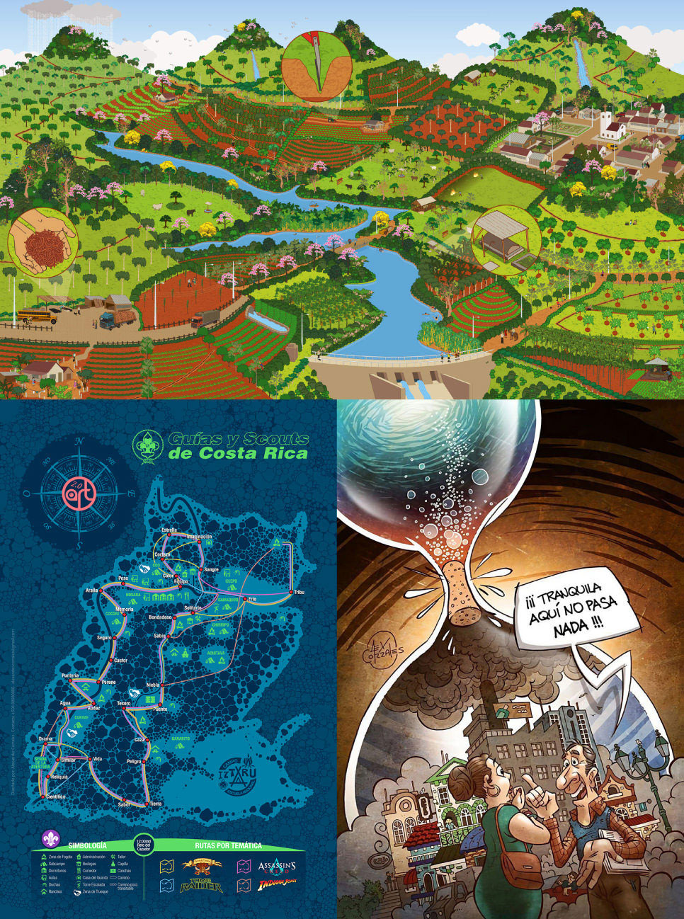 Various graphic design projects. 1) 'Good management of the Hydrographic Basin' puzzle for Catie's Environmental Education Program (printed size: 76x130 cm). 2) 'Adventure Rally' map for the Scouts of Costa Rica's Iztarú National Camp School. 3) Poster for IMN's project "Adaptation of the Water System to Climate Change".