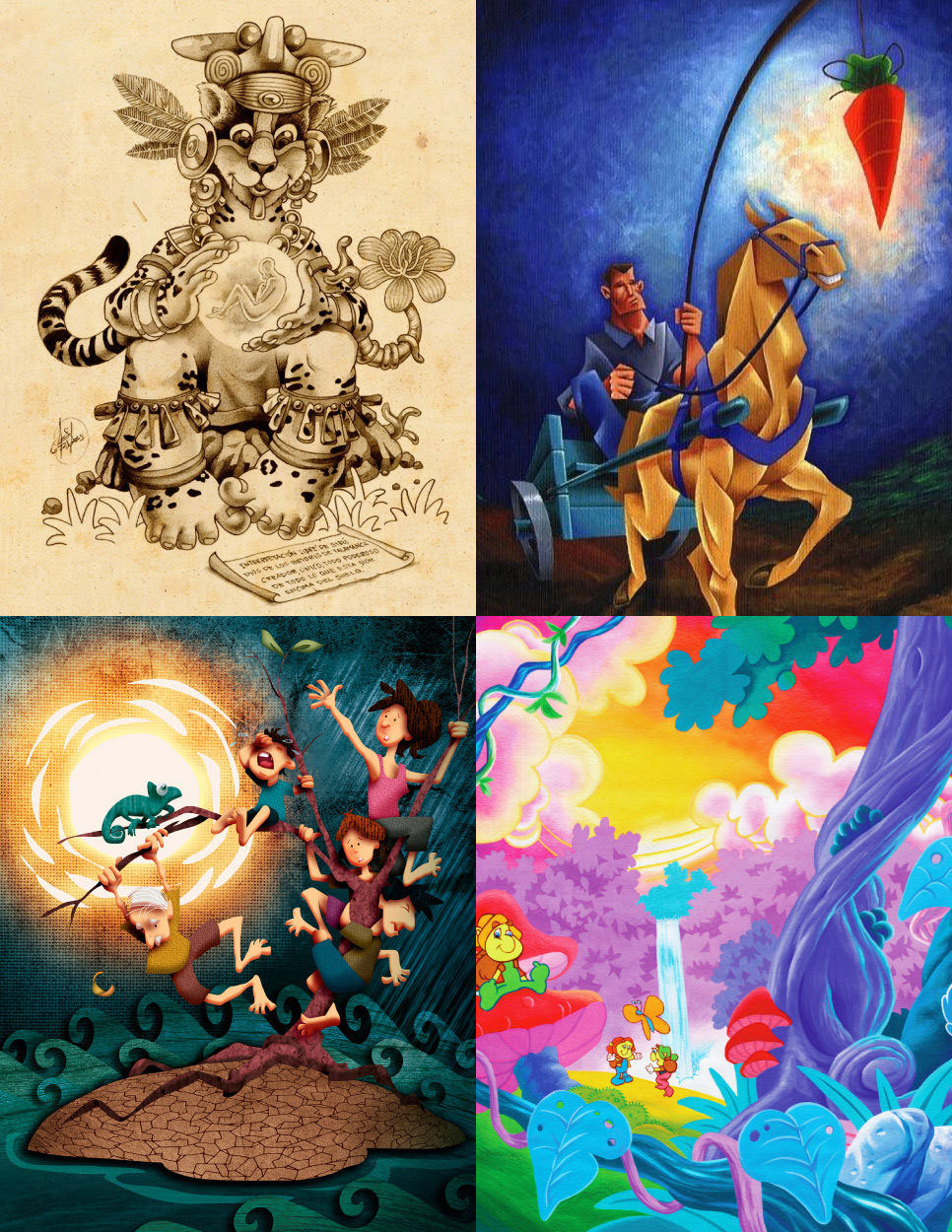 Various paintings and illustrations by Alex Corrales. 1) Handmade illustration: 'Sibu, God of the Bribri indigenous' from the collective book 'Bestiario' by the forum of illustrators of Costa Rica, FORO GAMA. 2) Acrylic on canvas: 'Follow the carrot', cover of Business magazine. 3) Digital illustration for a poster: 'Climate Phenomena - El Niño y La Niña' for the National Institute of Meteorology (IMN) of MINAE. 4) Cover illustration for the book 'Con las manos abiertas', part of RNTC's Culture of Peace Collection.