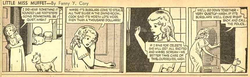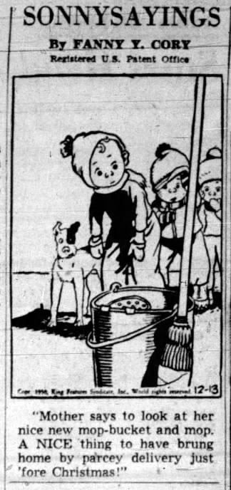 Fanny Y. Cory was one of the earliest female cartoonists in the USA. Around the turn of the 20th century, she worked in New York City as an illustrator for magazines and books. Later in life, she settled on a ranch in rural Montana, where she combined her family life with working on several syndicated newspaper features, mostly with the humorous antics of mischievous youngsters. After some short-lived attempts, she eventually created the long-running 'Sonnysayings' cartoon panel (1926-1956) and the orphan adventure strip 'Little Miss Muffet' (1935-1956). During her career, she has signed her work with F. Y. Cory, F. Cory Cooney and Fanny Cory Cooney, but she eventually settled on Fanny Y. Cory, sometimes shortened to "FYC".