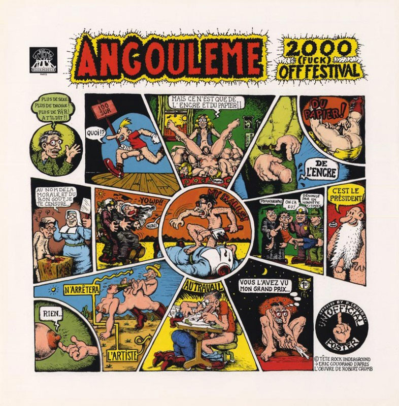 In 2000, Cougrand designed an unofficial poster for that year's edition of the International Comic Festival of Angoulême, held between 26 and 30 January. The official poster, designed by an anonymous artist, simply announced the names of the artists who would be present at the venue. Cougrand's alternative version was far more colorful and spoofed Robert Crumb's iconic cover of Big Brother and The Holding Company's 1968 album 'Cheap Thrills'. Just like Crumb's original, Cougrand's design is done in a comic strip style. But rather than directly trace the imagery on 'Cheap Thrills', Cougrand's poster uses the same font but adds colorized and sometimes slightly altered imagery from well-known Crumb stories.