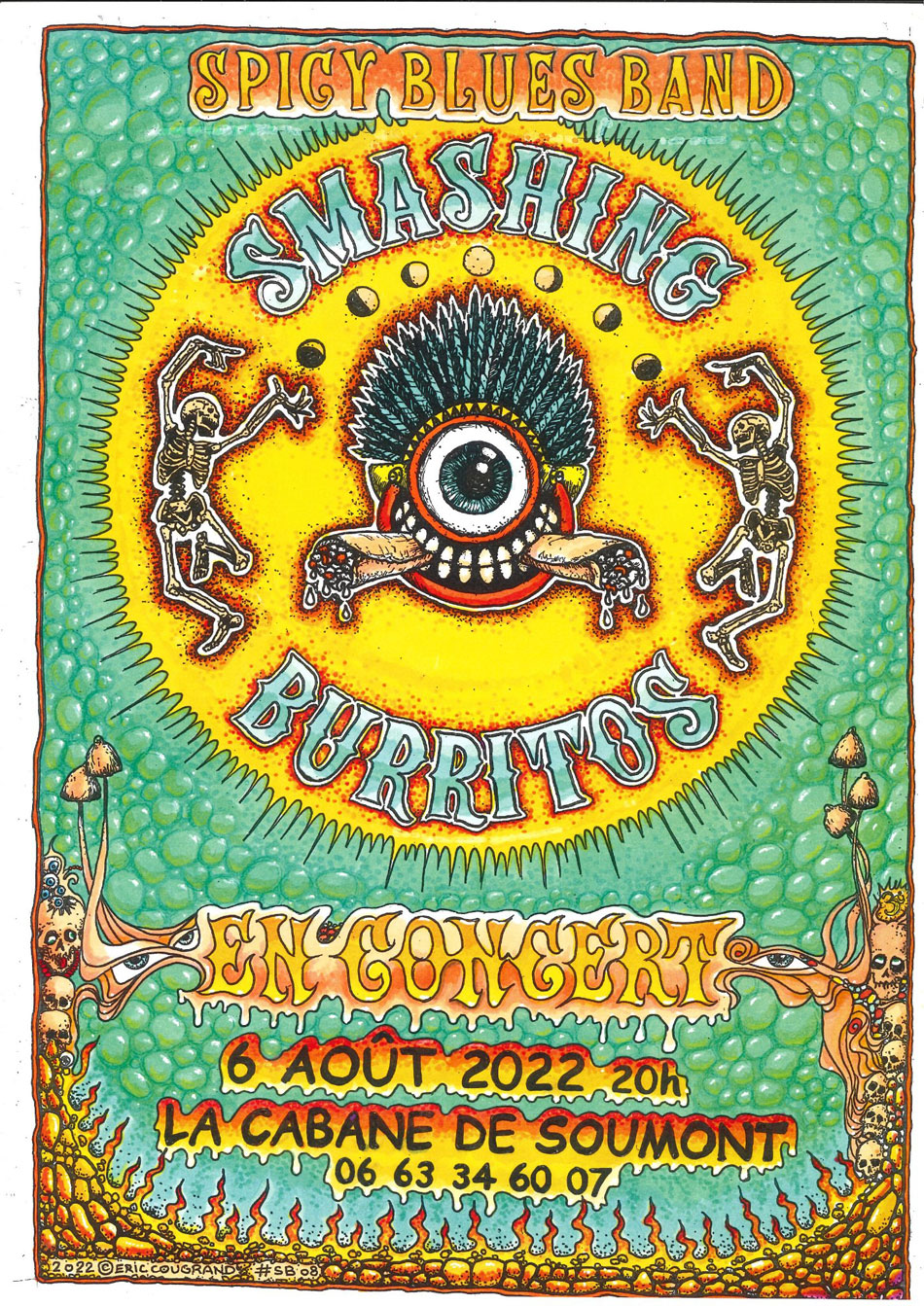 Eric Cougrand was also a prolific graphic artist, working in a psychedelic style. He livened up the album covers for Merrell Fankhauser's 'California Live' (1993), 'Early Years 1964-1967' (1994), 'Fool Moon' (1994) and 'Doctor Fankhauser' (1996), as well as 'Up and Down' (1996) by Luc Marianni's Seltae Beat. Much of his posters for these bands and his own group, The Smashing Burritos, mimicked the look of Stanley Mouse and Alton Kelley's trippy posters and album covers for The Grateful Dead. Cougrand also illustrated business cards for the Parisian venue Thé-Troc.