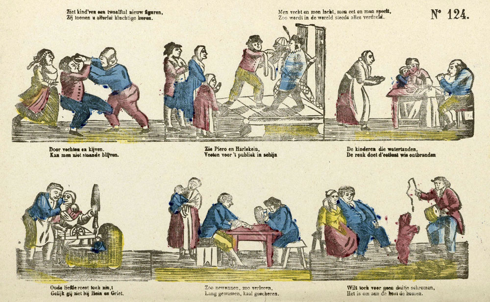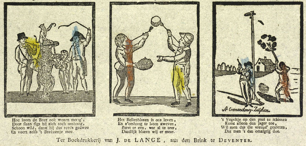 Active during the 19th century, Alexander Cranendoncq was one of the artists working on mostly educational and elevating catchpenny prints. His prints showed people and their professions, children's games and historical events. One of his prints showed the life of Dutch naval hero Jan van Speijk, who sacrificed himself during the Belgian Revolution, another one depicted the 1828 Russian-Turkish war. One notable Cranendoncq print made for printer J. de Lange in Deventer presented a great many children's games of the day. In nine images, the print not only showed riding a goat cart, a ride on the merry-go-round and archery, but also activities that are far more shocking to modern-day audiences, like having a bear dance with a whip, shooting a living bird from a pole and hitting off the head of a goose. Other prints, made for printer J. Noorduyn in Gorinchem, presented Dutch inventions, African tribes and people from Europe in their traditional costumes. A Cranendoncq print released by Mindermann in Amsterdam showed sixteen people in their professions, including merchants of mousetraps and bellows, kettles and irons, fish, bleached linen, figurines and hammers.