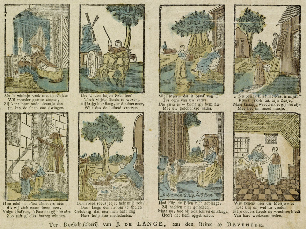 Not much is known about the life of Alexander Cranendoncq. He was born in 1799 in Maassluis, a town west of Rotterdam, and he died in 1869 in the city of Nijmegen. A large part of his professional life was spent in Zutphen. In a 19th-century dictionary of artist biographies from the Netherlands, 'Geschiedenis der Vaderlandsche Schilderkunst' by Van Eynden and Van der Willigen, we learn that Cranendoncq studied the art of engraving under Jan Oortman, an artist from Amsterdam. In 1819, Cranendoncq was praised for his woodcut picture series 'Proeven van Houtsneden, door A. Cranendoncq'. In the following year, the Nederlandsche Huishoudelijke Maatschappij ("Dutch Domestic Society") honored him with a Gold Medal and a prize of 25 ducats. As a woodcutter and engraver, Alexander Cranendoncq was an artist for several educational picture story prints, released by printers like J. de Lange in Deventer, Mindermann in Amsterdam, J. Noorduyn in Gorinchem and Brepols & Dierckx Zoon in Turnhout.