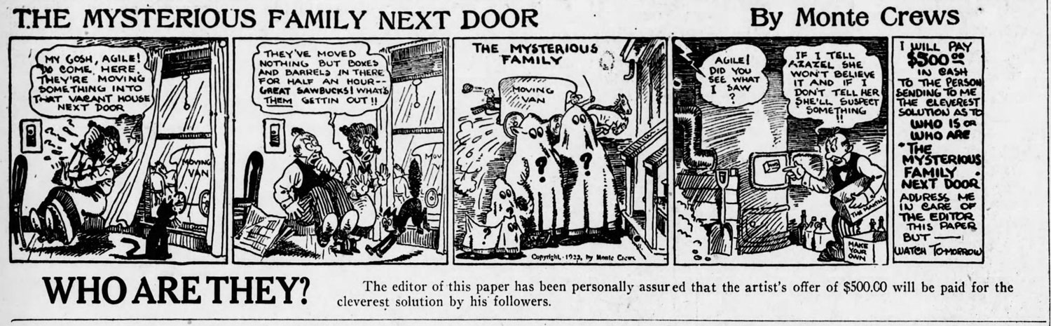 Crews' self-syndicated newspaper comic, 'The Mysterious Family Next Door' (1921-1922), was published in newspapers like The Merced Sun-Star and the Brooklyn Eagle Star. It stars a married couple, who one day notice an odd-looking family moving into their neighborhood. All members - even the dog - wear white hoods and robes with a question mark on them. The couple is naturally intrigued, even somewhat scared. In a continuous storyline they try to find out more about their next door-neighbors' identities and especially their mysterious activities.