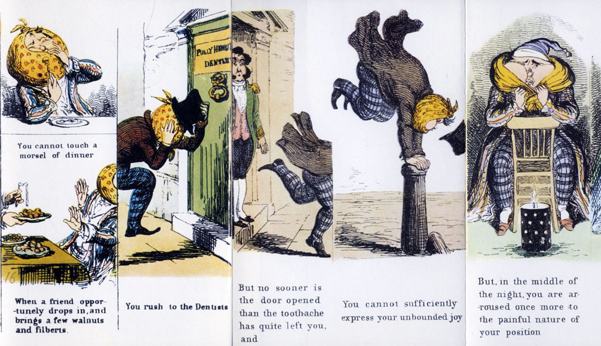 The same year Cruikshank also made 'The Tooth-Ache' (1849), a six-page long comic strip about the ordeals and eventual relief of a man with toothache. The story was written by London journalist Horace Mayhew, who worked for Punch. What makes 'The Tooth-Ache' particularly unique is the fact that it appeared in a book which folds out in accordion-style from the covers. A few years later 'The Tooth-Ache' was reprinted in the French magazine Le Petit Journal, under the title 'Le Mal de Dents. Molaire arrachée à Cruickshank' (1851). French cartoonist Nadar redrew the entire story, but at least gave Cruikshank credit, though misspelled his name in the process. A copy of 'The Tooth-Ache' is kept in the collection of The British Museum.