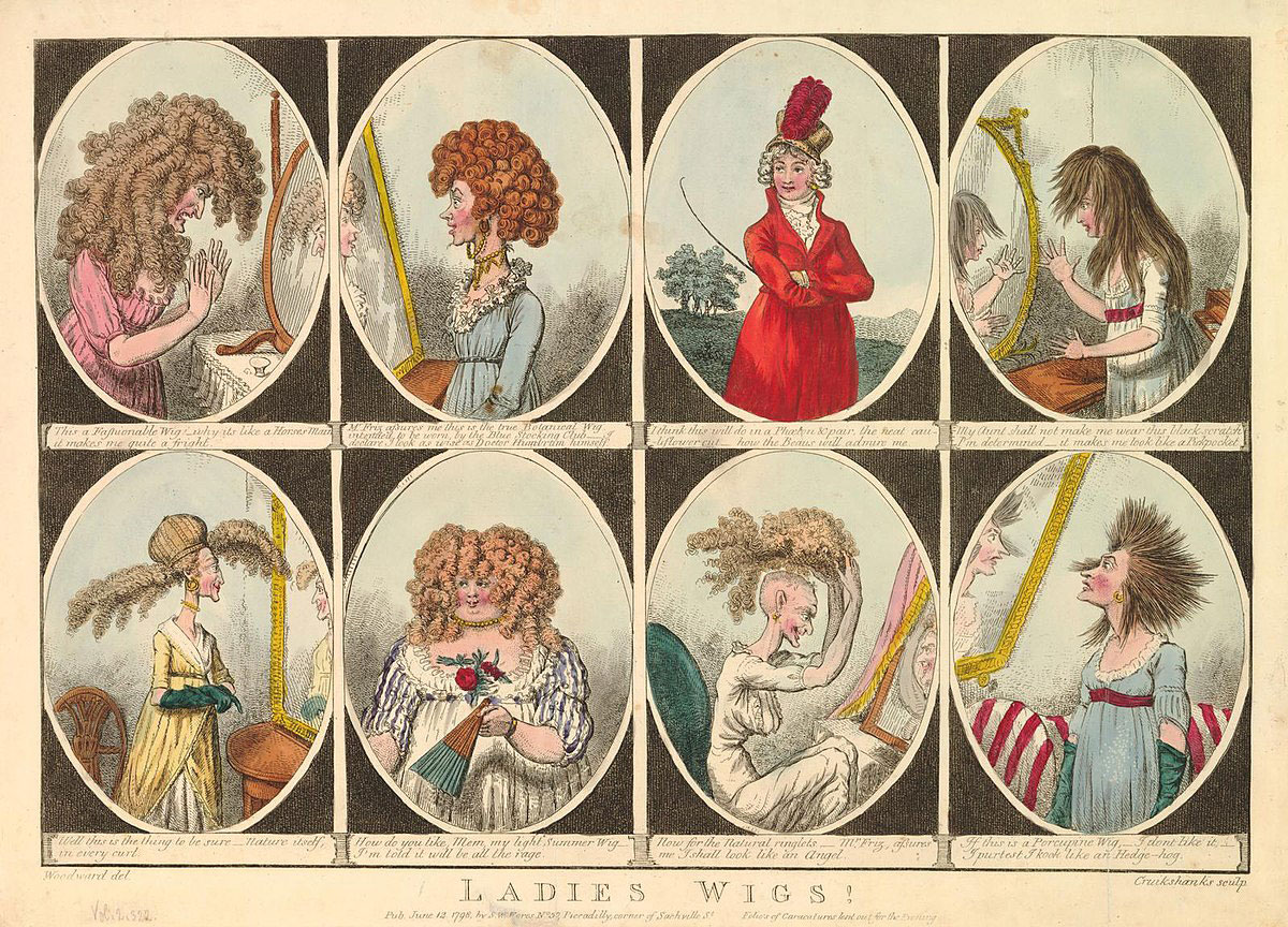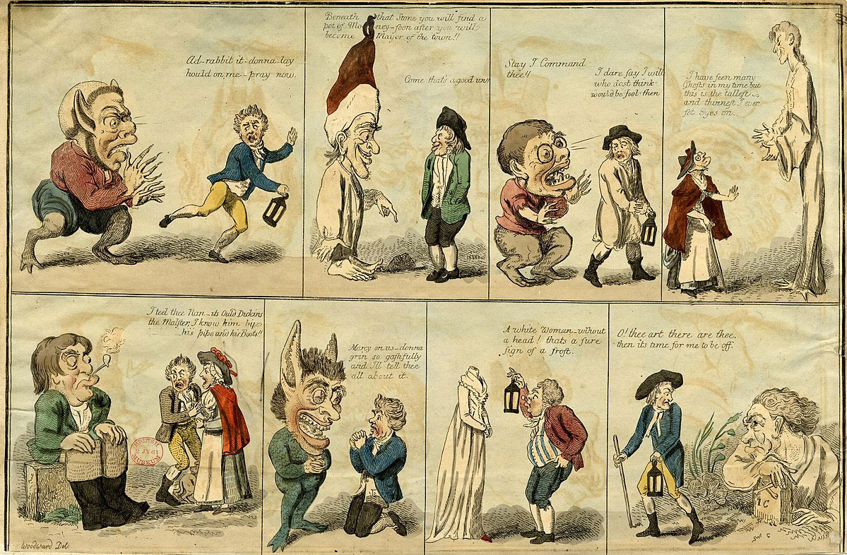 Other sequential cartoons by Cruikshank are more timeless and straightforward funny situations, like the self-descriptive 'Six Different Methods of Carrying A Stick With Their Effects' (1 August 1796) . 'Symptoms of Tippling' (1795) tackles alcoholics. 'Ourselves' (1 January 1796) features people who feel proud of themselves, yet are actually ridiculous. In 'A Collection of Ghosts' (25 February 1796), people have witty confrontations with all kinds of ghosts. The phantoms come in many shapes and forms, most with grotesquely large heads. Cruikshank targets gossipers in 'Family Secrets!!' (12 October 1797), while in 'Ladies Wigs' (12 June 1798) he takes the mickey out of the 18th-century wig trend. Love and lust were also a prime comedy target. In January 1796, Cruikshank made several gag scenes about this topic. In 'Symptoms of Love!!' (1796), Cruikshank ridicules declarations of love. 'Symptoms of Matrimony!!!' (1 January 1796) mocks marital bliss and 'Symptoms of Crim. Con!!' (1796) focuses on adulterers.