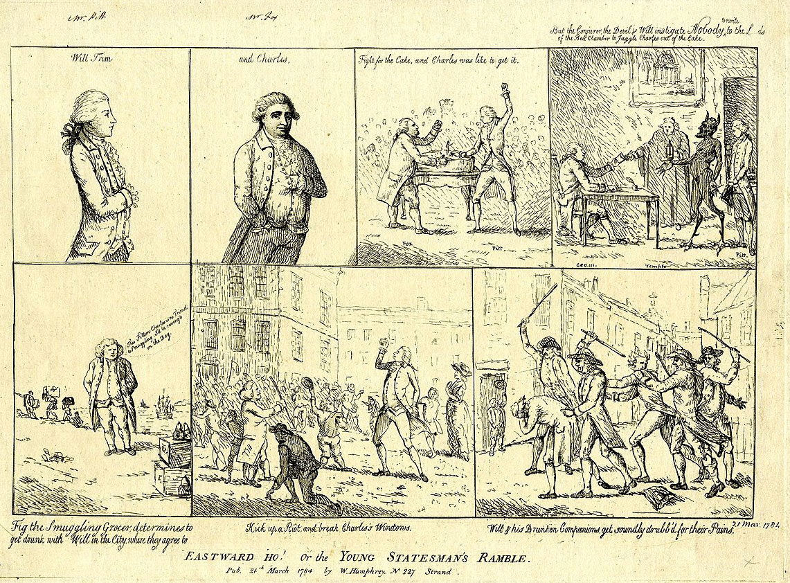Cruikshank also drew a few longer narrative sequences. 'Eastward Ho!, Or the Young Statesman's Ramble' (28 March 1784) portrays Prime Minister William Pitt the Younger and his political rival Charles James Fox in seven etched images. The first two panels serve as introductions of the two protagonists. We then see Pitt and Fox squabble over a cake, with Fox getting the upper hand. However, King George III and the Devil support Pitt's claims to this cake. The story continues with a grocer complaining about Fox' policies regarding smuggling. When Pitt returns from the Grocer's Hall, he joins a riot, throwing stones at Fox' windows. Yet, Pitt and other rioters are then thrashed away by men with sticks. The anti-Pitt propaganda tale is easy to follow, due to clearly divided panels. Yet the narration and dialogue are not consistent in their presentation. Sometimes text floats above characters' heads, other times it is printed above or underneath the panels.