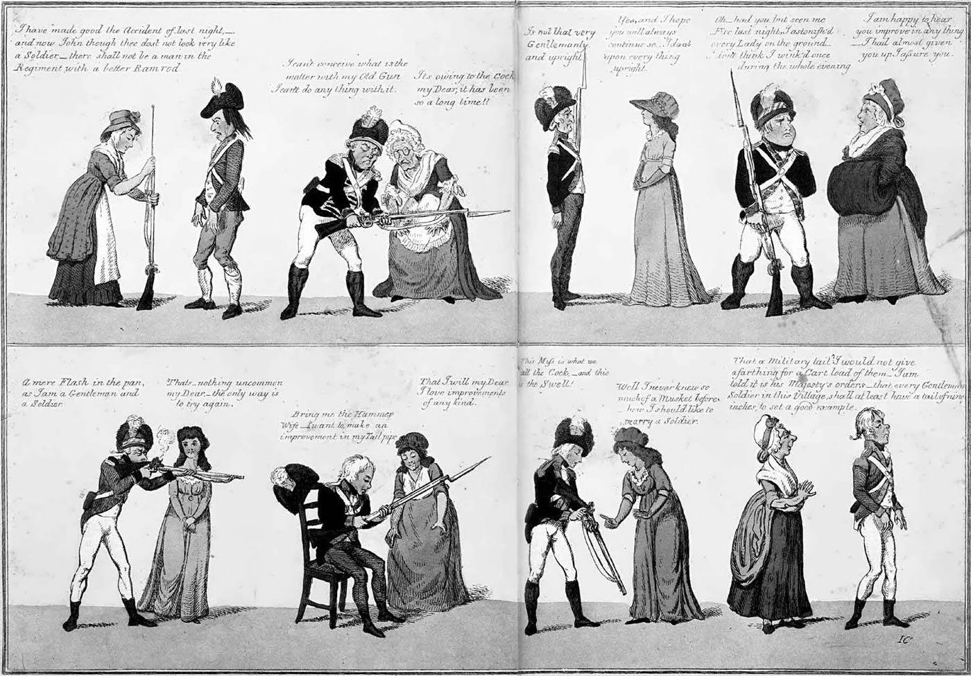 In Cruikshank's 'He Would Be A Soldier, or the History of John Bull's War-like Expedition' (1 July 1793), the national personification of the United Kingdom - John Bull - goes to war, but returns home poor, crippled and with loss of an eye. The story is told in seven individual scenes, but without panels. Cruikshank plagiarized this entire cartoon from James Gillray's 'John Bull's Progress', printed a month earlier on 3 June 1793. However, Gillray told the entire story in only four scenes, with clearly divided panels.