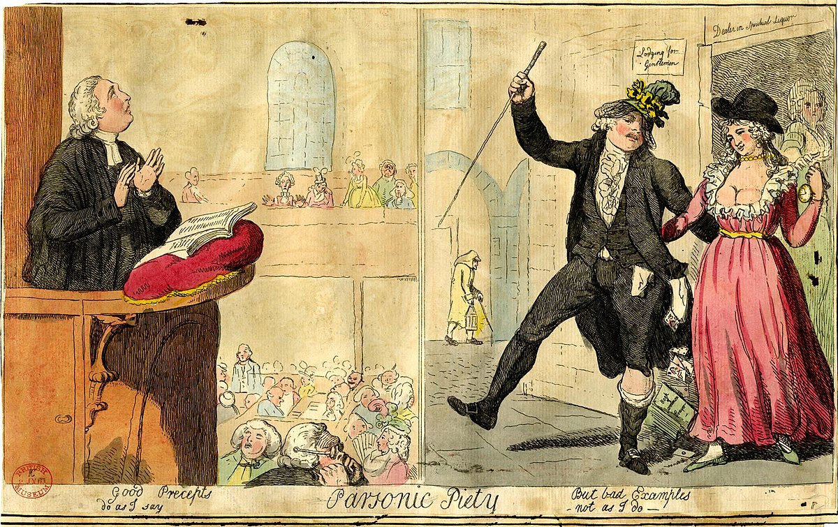 When London was alarmed by reports of a strange pervert attacking women with sharp objects, Cruikshank drew a two-panel sequence commenting on this "London Monster". In 'The Monster Cutting A Lady. Copper Bottoms To Prevent Being Cut' (1 May 1790), the criminal attacks a female passerby in the first panel. In the second panel, a tailor gives a woman a protective dress. Cruikshank also delighted in poking fun at religious hypocrisy. In the two-sequence illustration 'Parsonic Piety' (20 January 1794), a priest presents himself as a virtuous role model, with the subtitle 'Good Precepts. Do As I Say'. However, in the next panel, 'But Bad Examples. Not As I Do.', he leaves a brothel, with a prostitute under his arm.