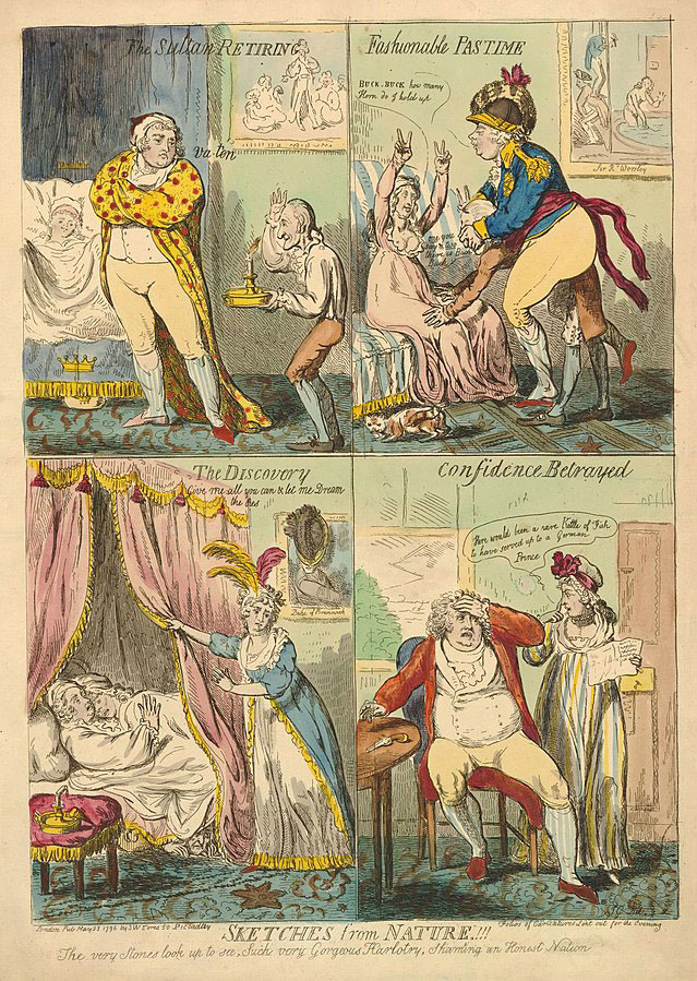 Cruikshank's 'Sketches From Nature!!!' (28 May 1796) portrays prince George (future George IV) and his mistress, Caroline of Brunswick, during their various affairs. The four-panel illustration follows a clear narrative, while making occasional use of speech balloons and handwritten texts floating above characters' heads. In 'This Is The House For Cash Built!' (1797), Cruikshank shows various people and objects that all contributed to the wealth and corruption within the Treasury. The entire sequence is narrated while spoofing the nursery rhyme 'This Is the House That Jack Built'. 'A Specimen of Scottish Modesty' (5 February 1798), portrays Henry Dundas, 1st Viscount Melville in various satirical situations. Almost a sequential work is 'Progress of Drunkenness' (1800), in which various stages of intoxication are ridiculed. Yet, rather than follow one drunk, Cruikshank shows different boozehounds in gradually more embarrassing situations. Of special note is the undated 'A Back-Side and Front-View of a Modern Fine Lady', portraying a nude woman going out for a swim at the beach. The picture story has no punchline, political subtext or dramatic development and basically serves an erotic function.
