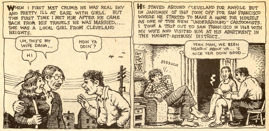 By the end of 1966, the guilt-ridden Crumb finally returned to his wife, who accepted him back. But the same old rut returned. In January 1967, when two friends invited him to move to San Francisco with him, Crumb instantly took the offer. He was so eager to leave that he let a friend inform his wife where he had gone. Three weeks later, he phoned Dana to come over too. In many ways, San Francisco was perfect for Crumb's temperament and career. In this center of the hippie subculture, his adult comics found their target audience in local counter culture magazines like Yarrowstalks and The East Village Other. The third issue of Yarrowstalks was even completely devoted to Robert Crumb's work. But since most of his comics for these magazines were unpaid, he still had to rely on his jobs with American Greetings and Topps.