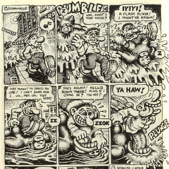 Other stories by Crumb are actually parodies of the naïve clichés and stereotypes found in old comics. In Zap Comix #3 (Fall 1968), the two-page 'Street Corner Daze', warns "young readers" of the dangers of heroin, presented as an ironic, child-like cautionary tale, complete with Mr. Natural being the voice of reason. Another example is 'On the Bum Again' (August 1970), in which Big Baby, an adult woman who still dresses and behaves like a baby, gives Mr. Natural a blowjob. The story isn't about pedophilia, but a parody of similar comic book babies with mature minds, like Billy DeBeck's Bunky and E.C. Segar's Swee'pea. Crumb just brings the absurdity of this concept to a logical end. The same can be said about his use of outdated caricatures of black people. Crumb often defended himself that he didn't invent these things: they were all once part of Western culture. He merely regurgitates the nonsense he was brought up on. Or, in his words: "I spent my whole childhood absorbing so much crap that my personality and mind are saturated with it. God only knows if that affects you physically!" Transported to a modern, mature context, all these archetypes feel very weird and disturbing. Crumb has, however, also used these retro elements in less offensive ways. In issue #6 of Arcade (Summer 1976), a cute bear couple goes through a series of banal, everyday events, deliberately done in a small-sized, monotonous lay-out. It's a more realistic depiction of how a real-life couple would live and a satire on life's repetitiveness.