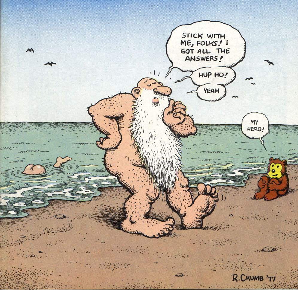 Crumb also contested that people often confuse him with his comic book persona. People seem to think they "know" him, by taking everything in his comics literally. In the same way, he is often confronted with stories he drew in the 1960s and 1970s, while his career has spanned for over more than half a century, showing very different sides of his character. In 'I'm Grateful, I'm Grateful' (Weirdo #25, Summer 1989), he summarizes the things he is actually happy about in his life. While it's true that there is enough offensive material by Crumb to fill two entire books: 'Bible of Filth' (Futuropolis, 1986) and 'R. Crumb's Sex Obsessions' (Taschen, 2007), there has also been enough more gentle work to fill another: 'The Sweeter Side Side of R. Crumb' (W.W. Norton & Company, 2011). In general, fans have defended Crumb for at least being consistent in drawing what's on his mind and being as hard on himself as anybody else. Alison Bechdel even praised Crumb: "If everybody were as honest in their work, it'd be a better world."