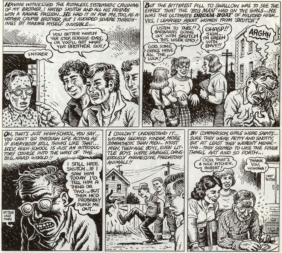 To the outside world, the Crumbs seemed like a decent all-American, church-going family. But Robert and Charles felt like social outcasts. They were bullied at school and unpopular with girls. They accepted black people in a time when most white people in their neighborhood were racists. As Charles grew older, he became more critical of politics, religion, corporate thinking and so-called traditional values. Since they had a close, brotherly bond, Robert was strongly influenced by Charles' personal tastes and opinions.