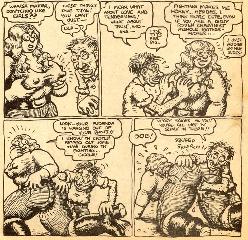 Crumb's work and underground comix in general ought to be understood within the context of the repressive 1950s and free-spirited 1960s. Much like his readers, he had grown up with carefree and mostly bland children's media of the 1950s, when many topics were considered taboo. A decade later, Crumb drew everything that wasn't "allowed" in his comics. Since the medium was so associated with innocent children's entertainment, it was shocking but also liberating to see Crumb's characters swear, have sex, take drugs, discuss politics or die gruesome deaths. Although pornographic comics had existed before and family-friendly comics with layers for mature readers too, Crumb's personal and bizarre stories couldn't be pigeonholed into one of these genres. The explicit sex scenes are often part of a larger, thematically different story, where Crumb confronts the reader with dark satire or plain weird plot twists. All his attractive women have a very specific look: huge buttocks, thick legs and massive thighs. And if this wasn't enough to turn off some lustful readers, many stories feature cute cartoon characters and funny animals, giving the sex scenes a disturbing undertone.
