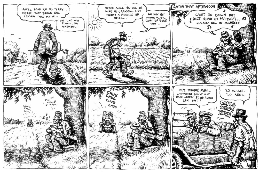 In some of his 1960s and early 1970s comics, Crumb quoted old song lyrics. From the mid-1970s on, he made direct graphic homages to old jazz and blues. 'That's Life' (Arcade #3, Fall 1975), is a bittersweet archetypal tale about how a 1930s African-American blues musician dies a short and inglorious life, only finding posthumous appreciation with record collectors. 'Patton' (Zap Comix #11, February 1985) is a short biopic about Delta blues legend Charlie Patton, while 'Jelly Roll Morton's Voodoo Curse' (Raw #7, May 1985) delves into a strange backstory about jazz musician Jelly Roll Morton's final years. Crumb also explained his love for old music and contempt for modern music in the editorial comics 'The Old Songs Are The Best Songs' (Weirdo #5, May 1982), 'Where Has It Gone, All the Beautiful Music of Our Grandparents?' (Weirdo #14, Fall 1985) and 'Street Musicians' (The New Yorker, 19 August 1996). He additionally provided illustrations for a series of biographical cards about notable musicians, released by Yazoo. These three collections, 'Heroes of Blues' (1980), 'Early Jazz Greats' (1982) and 'Pioneers of Country Music' (1985) were later all compiled in book form by Harry N. Abrams as 'Heroes of Blues, Jazz and Country' (2006).