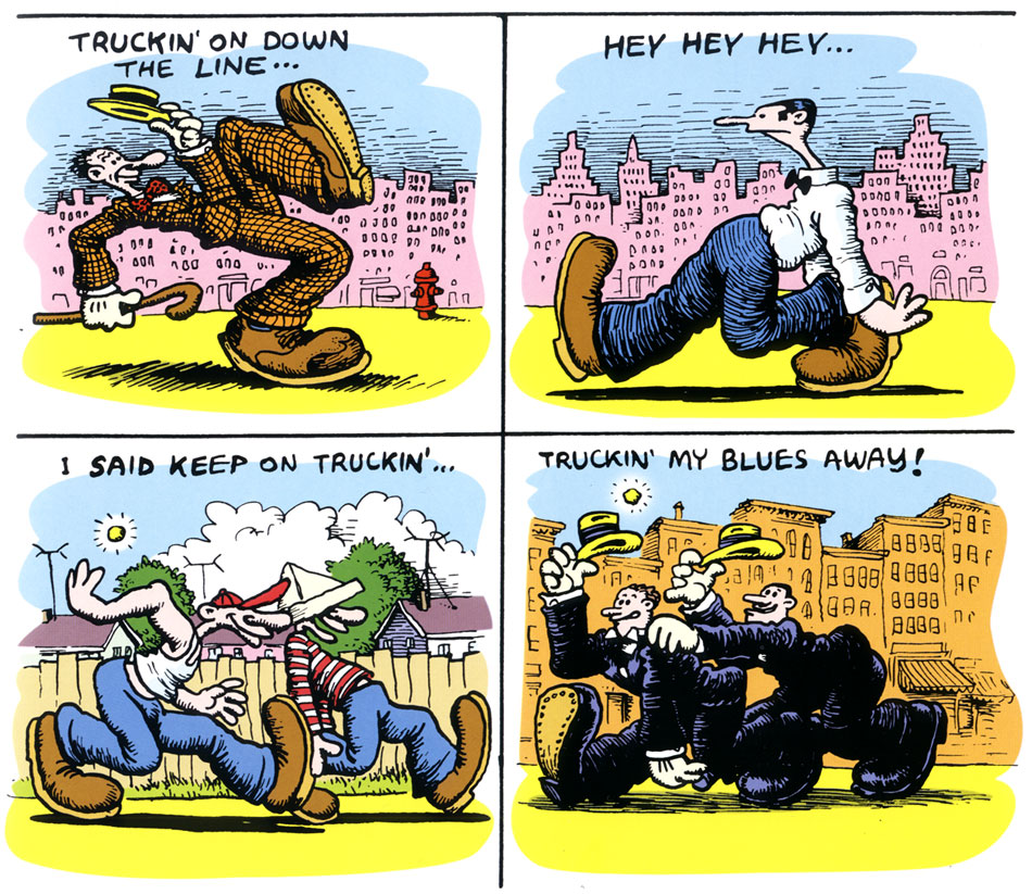 In the first issue of Zap Comix (February 1968), Crumb drew a comic based on the Blind Boy Fuller song 'Truckin' My Blues Away'. Titled 'Keep on Truckin'', it featured a group of men who walk with their feet prominently placed in the foreground, while their bodies tilt backwards. The happy message struck an unexpected nerve with audiences. The image and the phrase were bootlegged repeatedly on shirts, posters and other merchandising. Bands like the Grateful Dead ('Truckin', 1970) and Deep Purple ('Space Truckin', 1972) based songs on it, and in 1971 John Lennon was photographed in Cannes imitating the pose. In the early 1970s, future TV actor Tony Danza had a 'Keep on Truckin' tattoo, but later had it removed.