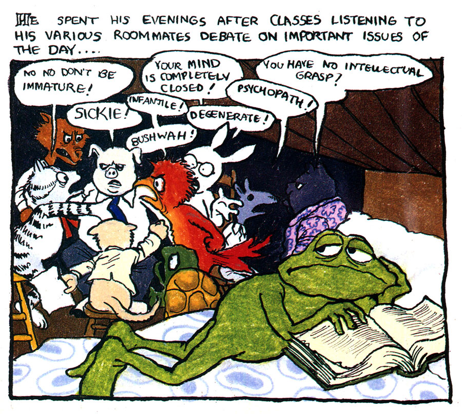 Other stories in Hup are more contemplative, such as 'My Troubles With Women, Part 2' (Hup #1, February 1986), 'The Story of My Life' (Hup #3, November 1989) and 'You Can't Have Them All: Magnificent Specimens I Have Seen' (Hup #4, 1992), in which Crumb examines his obsessions with the opposite sex. His existential angst is prominent in 'Can You Stand Alone and Face Up to the Universe?' (Hup #4, June 1992) and an adaptation of a chapter from Jean-Paul Sartre's novel 'Nausea' (Hup #3, November 1989). Hup only lasted four issues, but in issue #3 Crumb did receive a congratulatory letter from Disney animator Ward Kimball.