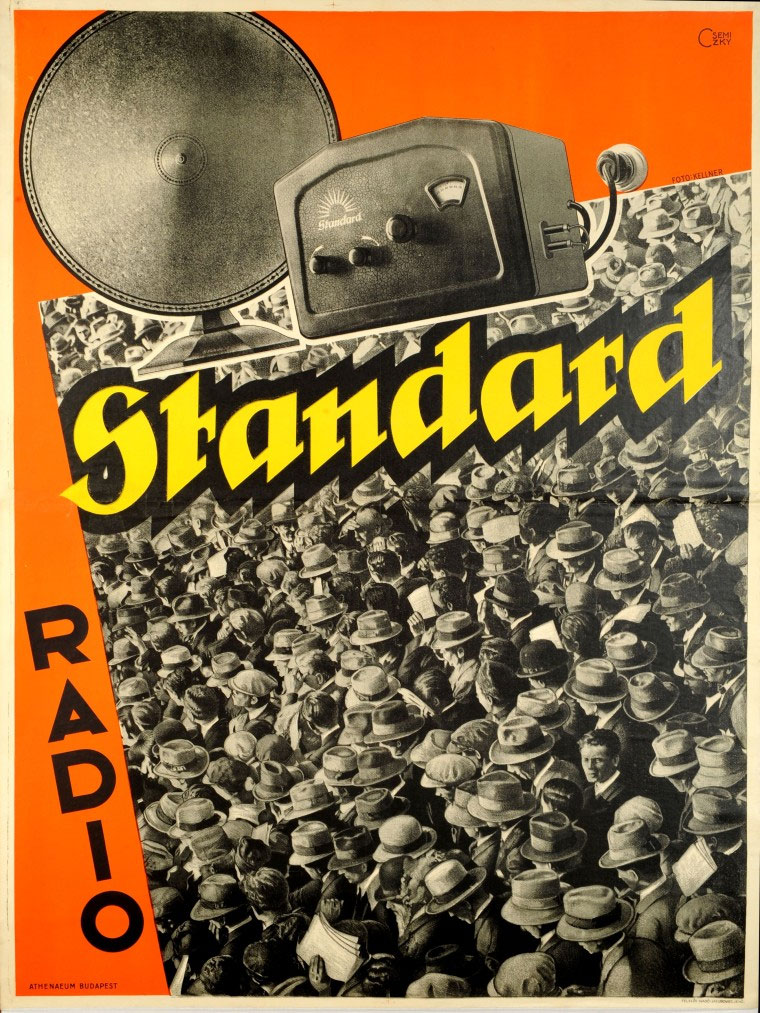 Csemiczky continued to design posters throughout the 1930s and 1940s, and with István Irsai he was one of the main artists who continued to work in the modernist style. Csemiczky's posters were characterized by their strong colors, flat shapes and modern typography, while his collages made use of self-made photographs. His work shows a great sense of modern technology. Csemiczky designed posters promoting electronic equipment, for instance Tungsram light bulbs. The radio companies Standard, Orion and Telefunken were also among his clientele.