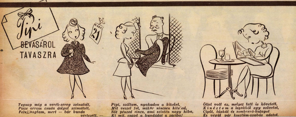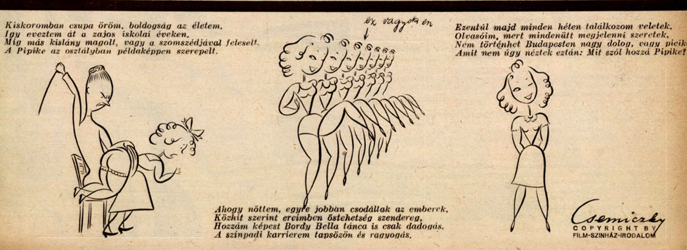 For this magazine, Csemiczky also created the comic strip 'Pipi a görl' (1941-1944), often shortened to just 'Pipi'. Debuting in issue #10 of 1941, Pipi is a poor and not too bright dancing girl, who aspires to become an actress. Csemiczky drew 148 episodes, all with text captions set to rhyme. The feature ran for three years, until in April 1944 the magazine was abruptly canceled, following the German invasion of Hungary. Film Színház Irodalom reappeared after the war.