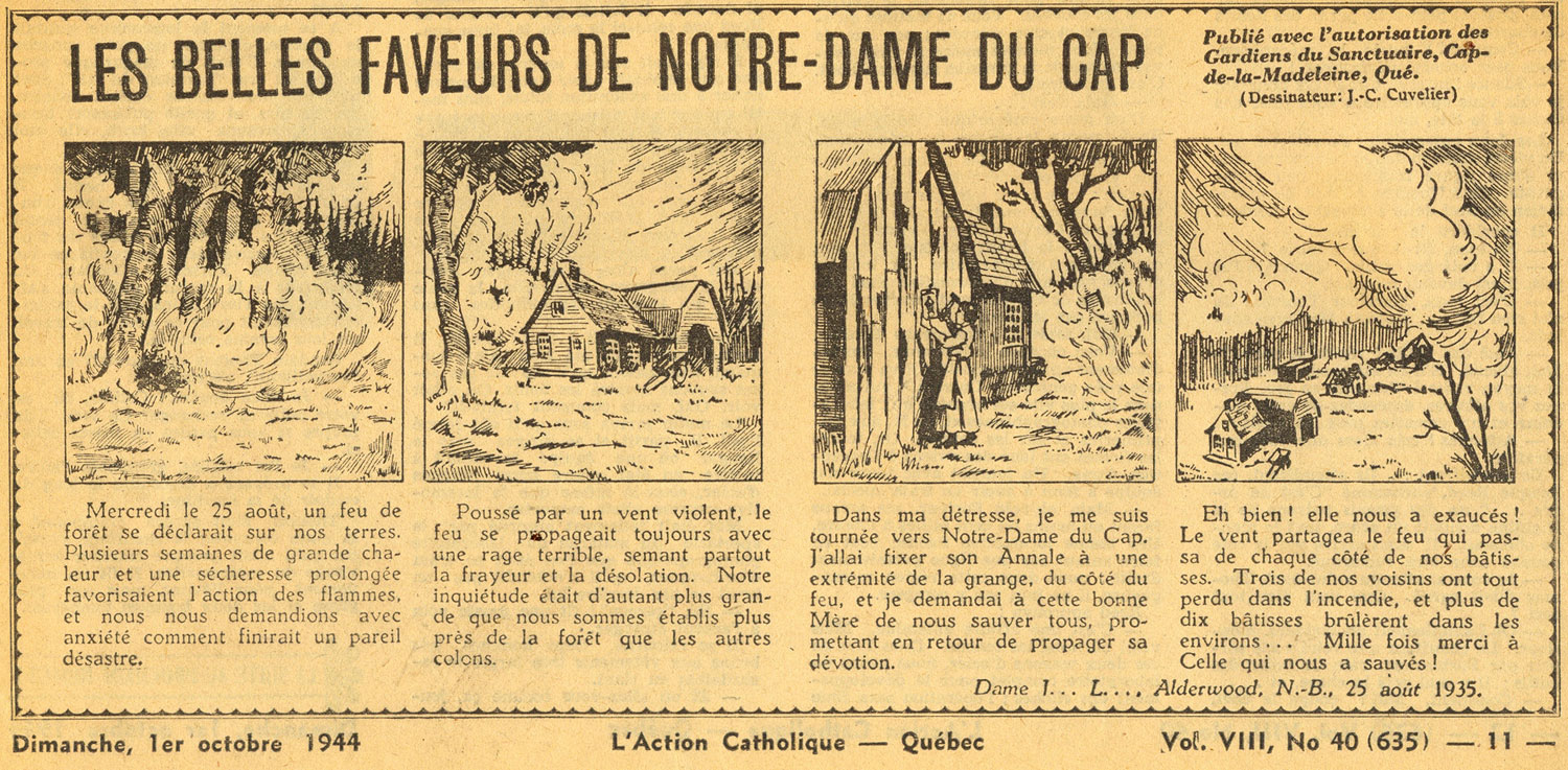 Cuvelier subsequently drew another balloon strip, 'Philippe Beaulieu', based on a story credited to Father Gabriel Sarrazin (7 September through 29 October 1937), as well as a text comic adaptation of James Fenimore Cooper's 'The Last of the Mohicans' ('Le Dernier des Mohicans', 3 November 1937-26 March 1938). 'Philippe Beaulieu' was later published under the title 'Ravisseuse de Bonheur' in Ma Gaspésie (date unknown). Years later, between 18 June 1944 and 18 March 1945, L'Action Catholique published the text comic 'Les Belles Faveurs de Notre-Dame du Cap'. It was another religious story based on Our Lady of the Cape, the local title given to Mary the Mother of God, whose basilica in Trois-Rivières attracts thousands of pilgrims each year. The strip was "published with the permission of the Sanctuary Guardians, Cap-de-la-Madeleine, Quebec", and was credited to "J.-C. Cuvelier", although this was most likely Jean-Jacques Cuvelier.
